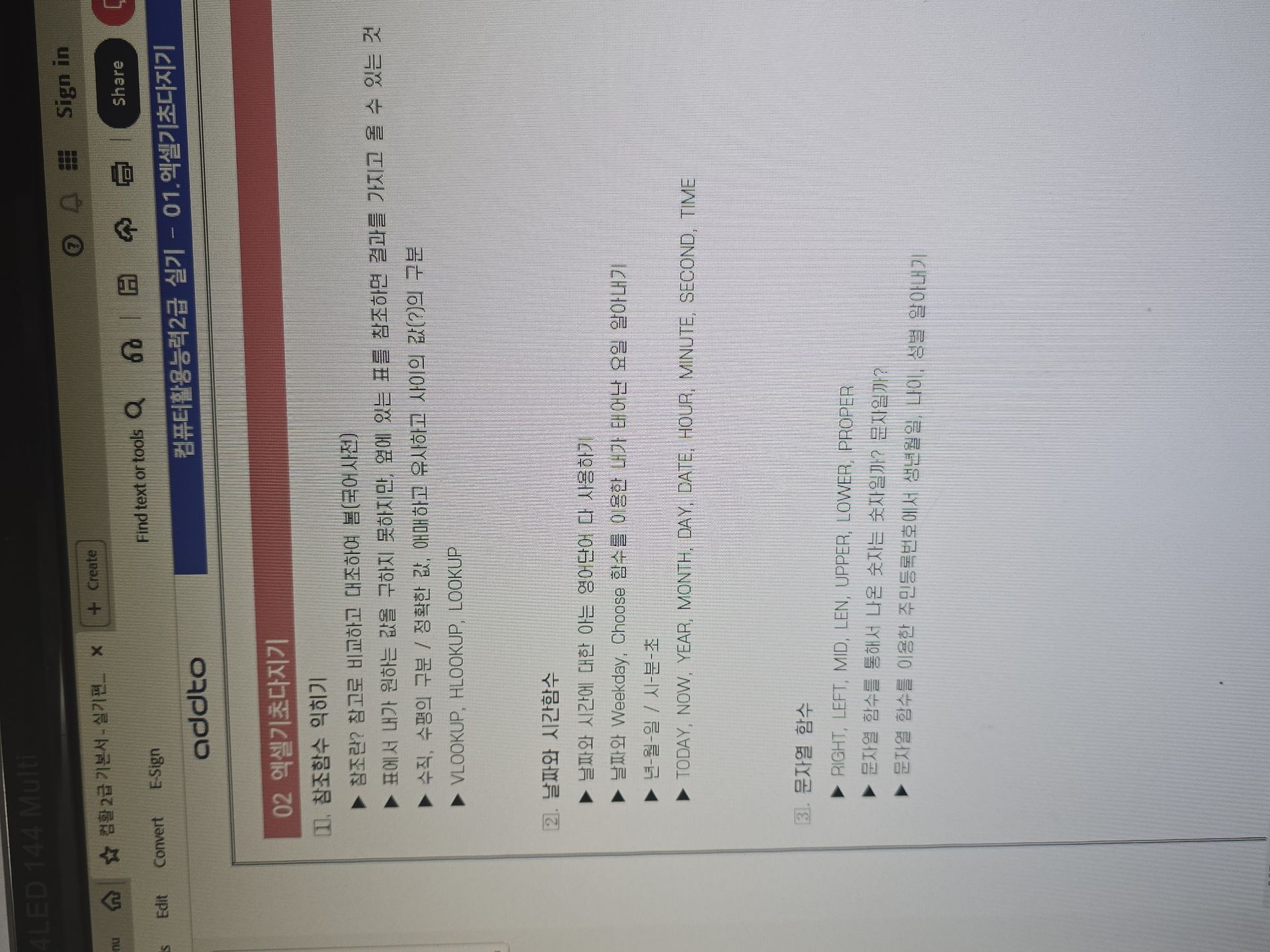 - nave**** / 2025-04-01 BEST #필기+실기 *이미남 컴활 1급 필기+실기 수강 후기* 컴활 1급 실기 엑셀 함수 열공 후기!!! 컴활 1급 실기 엑셀 함수 열공중, 오늘은 2일차라 학습 커리큘럼대로 3강-5강 듣기가 목표임. 1강을 통해 column, row, number, ref - rank.EQ 함수 , range - countif 함수, array 등 함수의 영어단어들 외우기를 마쳤다. 오늘은 참조함수, 날짜 시간함수, 문자열 함수로 시작한다. 필기 때부터 날 괴롭혔던 lookup함수... 참조함수란 표에서 내가 원하는 값을 구하지 못하지만 옆에 있는 표를 참조하면 결과를 가지고 올 수 있는 것이라 한다. ++ xlookup이 추가되었다고 한다. 표를 보고 행인지 열인지 어느 값을 쓸지를 보고 V를 쓸지 H를 쓸지 선택해서 사용하면 된다. 어디에서 절대참조가 필요한지도 연습하면서 F4키 눌러준다. True(1)/False(2) 정확한 값이 필요한지 유사값이 필요한지도 구분하여야한다. VLOOKUP(lookup_value, table_array, col_index_num, [range_lookup]) 샘 강의 듣고 오늘자로 뽀갠다!!!! 필기는 2트로 냅다 따버렸지만 독학 실기의 벽에 가로막힌 나에게 단비같은 애드투 강의가 내려왔다... 아예 컴활 다시 공부할 생각도 안하고 있어 외웠던 함수들도 까먹고 있었는데.. 차근차근 짚어주시는 애드투 이미남 선생님... 감사합니다 흑흑