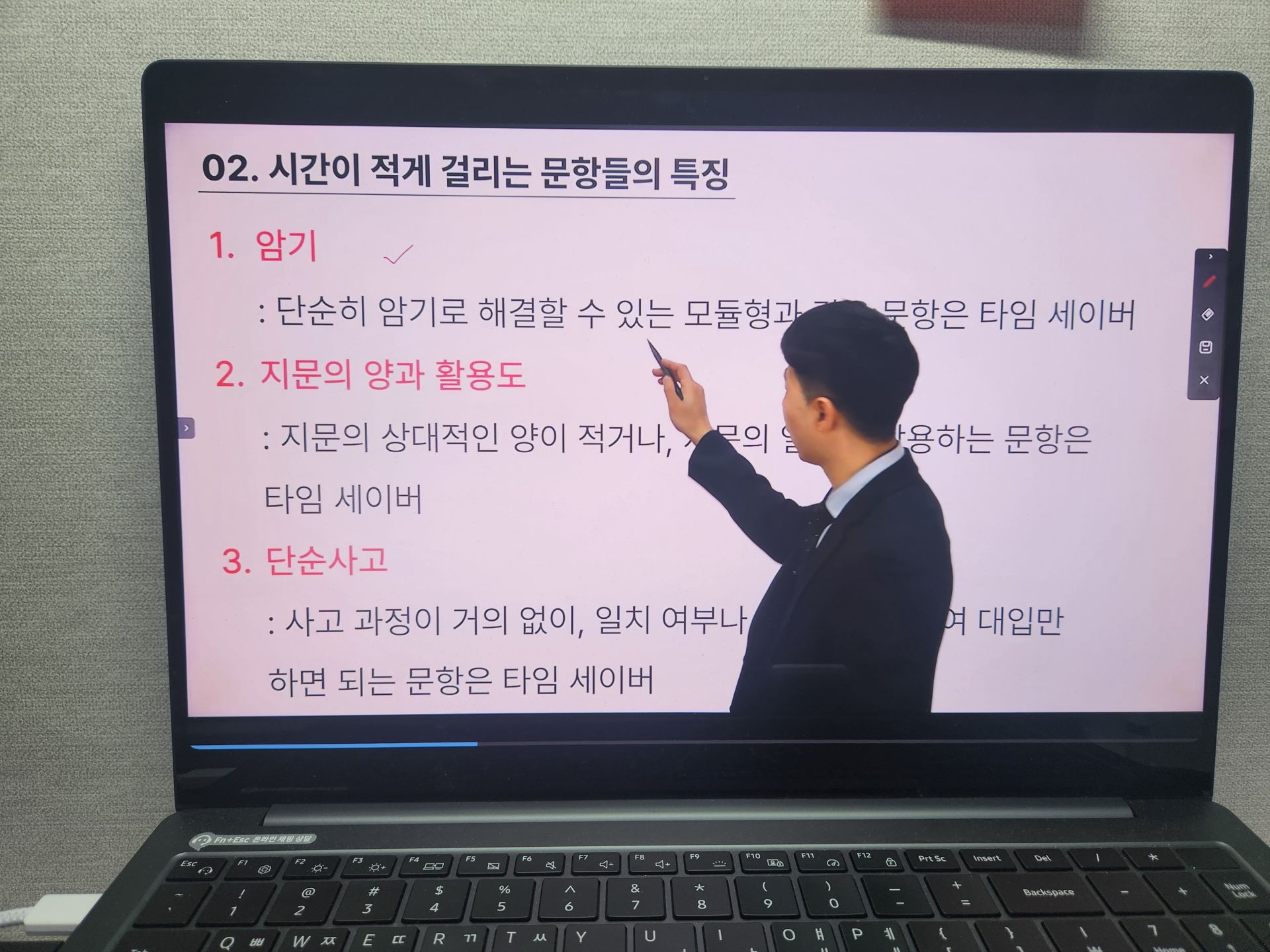 설명이 너무 늘어져도 금방 헤이해지는데.. 박수웅 강사님은 중요한 핵심만 간결하게 알려주시고 해설에 군더더기가 없으셔서 강의 끝날 때까지 집중력을 유지할 수 있었어요. 그리고 무엇보다 가장 도움이 됐던 것은 시간 단축을 위한 비법입니다.