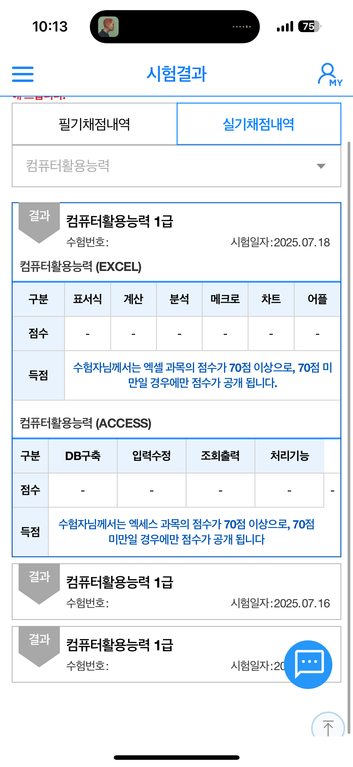 #학습량이 적당해요 #초보자 추천 +-1[컴활 1급 필기 합격 후기] ㅁ 공부방법 : 1) 이미남 컴활 커리큘럼에 맞춰 실기 공부 선행 2) 엑셀, 엑세스 기출문제 적응하기까지만 강의 수강 후 필기 5일 준비( 하루 3시간씩 총 15시간) 3) 필기 5일 준비기간 동안 이미남 컴활 필기 강의 기출문제 10회분 수강 (단순 정답 외우는 것 보다, 약간의 이해를 더하면 더 좋음) ㅁ 시험결과 : 63점 합격 (1과목 50, 2과목 75, 3과목 65) 간당간당 했다... ㅁ 시험후기 : 생각보다 쉽지 않았다...... - 기출문제 답만 달달 외워가도 문제은행식이니 평균60점은 충분하지 않나 안일하게 생각했다 - 1과목부터 정확하게 정답을 아는게 많지 않은 느낌이었다. (2개중에 1개 같기는 한데 ㅜㅜ ) - 2~3과목 역시 2지선다가 많은 느낌이었으나, 실기에서 공부한 내용을 기초로 정답을 유추하였다. - 실기공부 안하고 필기공부 먼저 했으면, 100% 떨어졌을 것이다. (왜 실기 먼저 공부하는지 알게됨) - 단순히 기출문제 문제, 정답만 외워서는 합격하기 어렵다. - 강의를 토대로 '왜' 보기가 정답인지, 조금이라도 이해하려고 노력했던 것이 많은 도움이 되었다. (쌤이 설명해주는 내용 잘 듣자) 시험 감독관님께서 먼저 풀면 먼저 퇴실 가능하다하여, 후다닥 풀고 나가려고 했는데, 시험종료 5분 전에 간신히 다 풀었다. (10분도 안되서 퇴실한사람이 절반 이상이었던 거 같은데, 천재인지 포기한건지.. 음.. ) 결론적으로, 필기 강의 (기출문제 10회분) 수강하고, 시험시간 1시간 동안 열심히 최선을 다해서 풀면 합격합니다. (중도퇴실 ㄴㄴ)