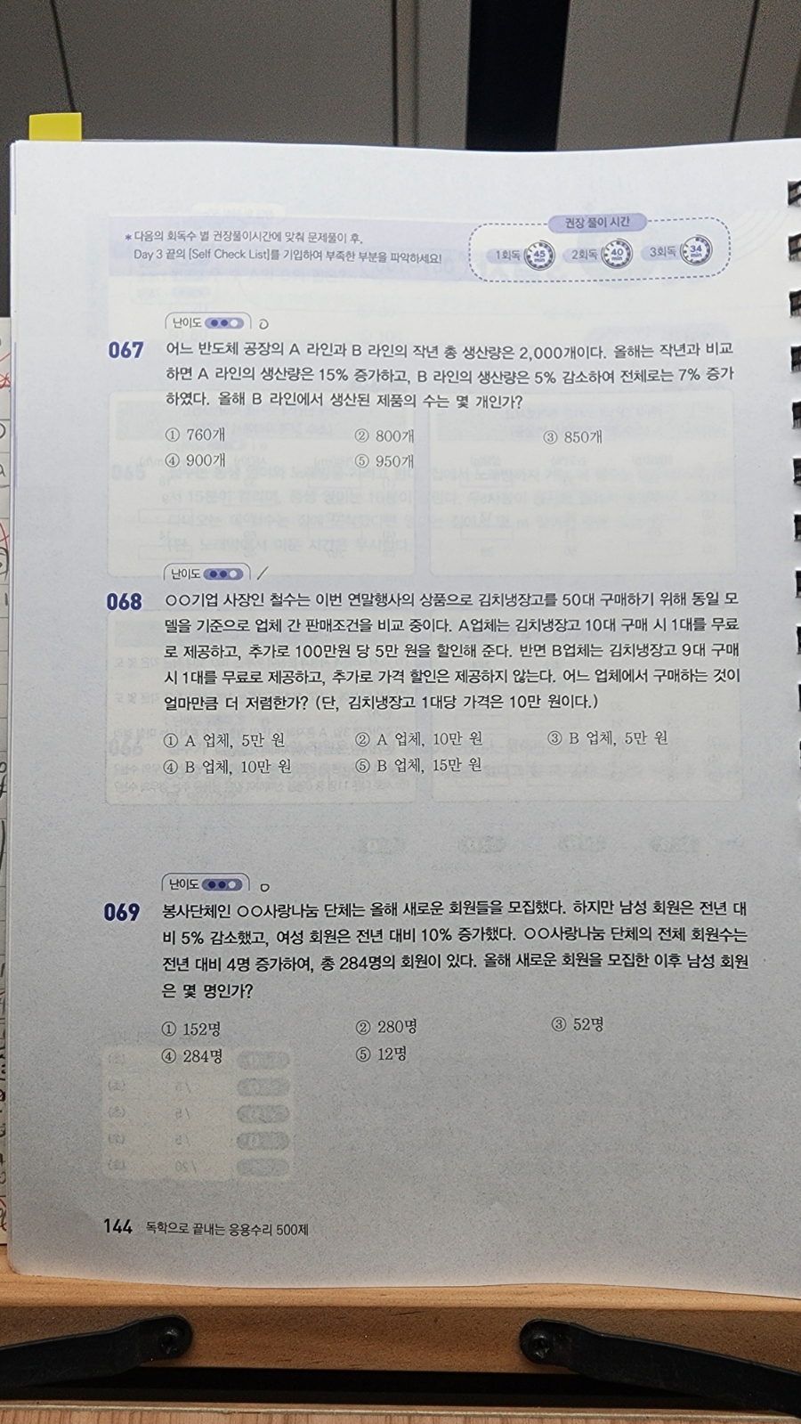 독끝 스터디 과정 2주차에는 박수웅 선생님과 '자료해석'과 '응용수리' 진도를 나갔습니다. 개인적으로 제일 취약하다고 생각하는 파트라 문제를 보기만하면 지레 겁부터 먹곤했는데, 선생님께서 알려주시는 풀이법을 하나하나씩 차근히 따라가다보니 생각보다 쉽게 풀릴 수 있다는 문제라는 점을 깨닫고 신선한 충격을 받은 적이 정말 많습니다... 괜히 명강의,명강사로 불리는 게 아니더라구요 ㅠㅠ bb
