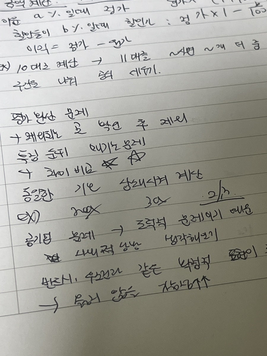 금액이나 조건들 일일이 계산하거나 세어보는 식으로 했는데 시간 단축할 수 있는 법을 생각할 수 있게 됐어요.