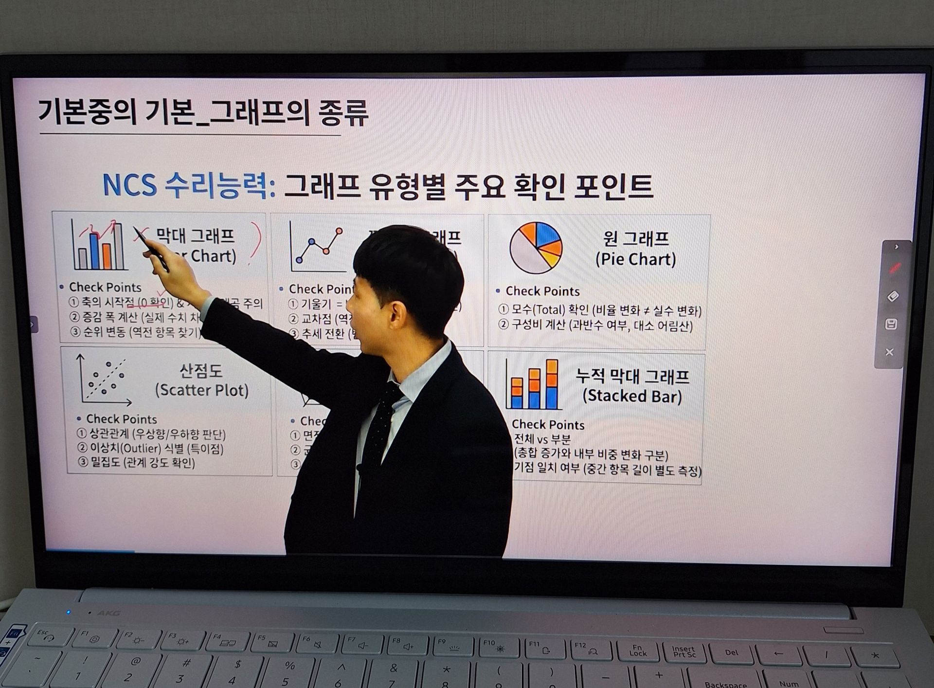 2강과 3강에서는 코레일 NCS 기출을 기반으로 실제 시험에서 푸는 순서와 과감히 버려야 할 유형, 그리고 다 계산하지 않아도 되는 필수 수리 연산법만 정리해 주셔서 문제 접근 속도가 눈에 띄게 빨라졌습니다. 특히 ‘다 풀지 않는다’, ‘되도록 덜 계산한다’는 강의 콘셉트가 수험생 입장에서 현실적으로 와닿았습니다. 이후 유효숫자, 어림산, 응용수리 30초 풀이법, 자료일치·독해 유형 공략까지 이어지며 실제 시험장에서 바로 써먹을 수 있는 기준이 정리되었습니다.