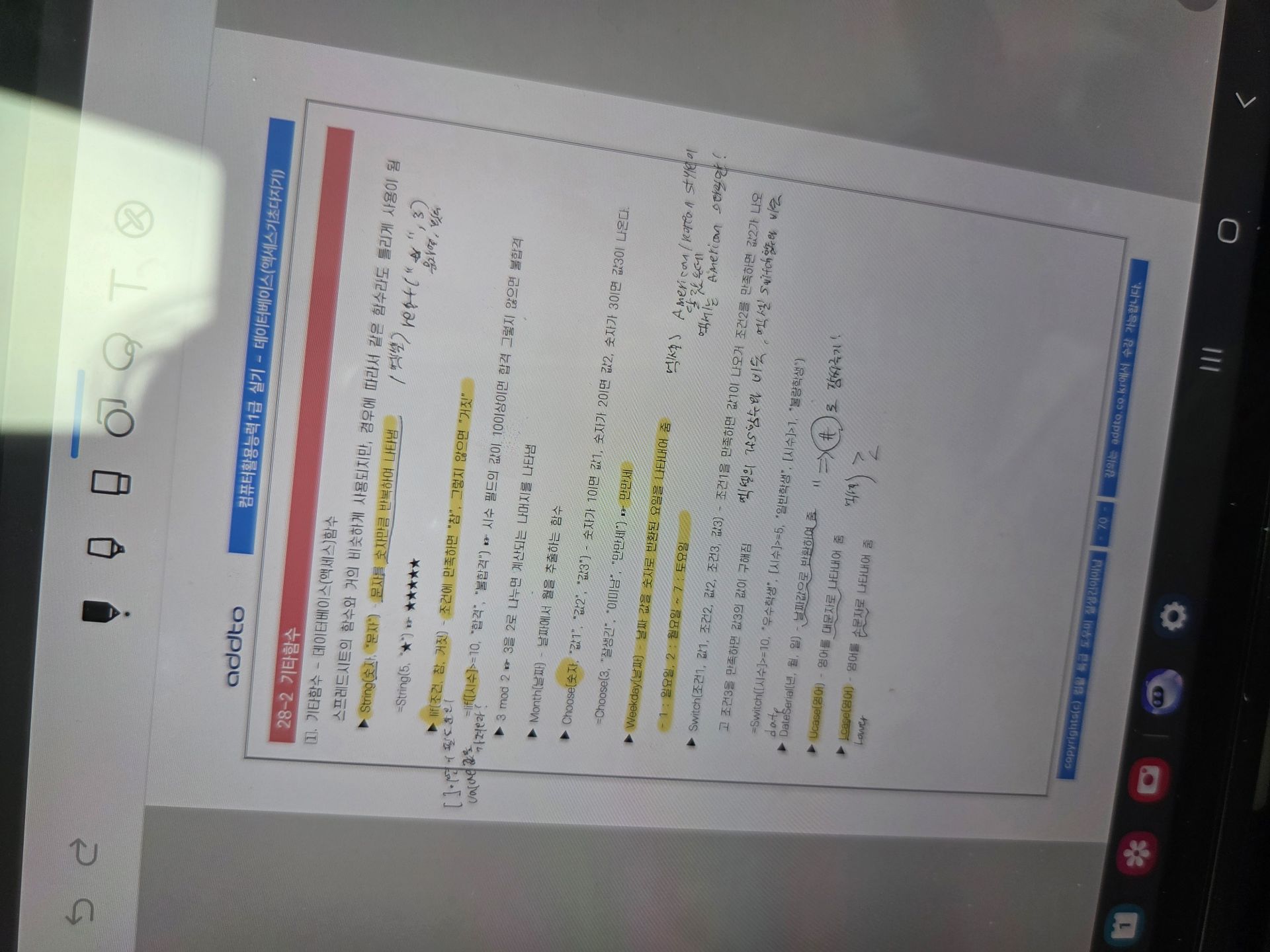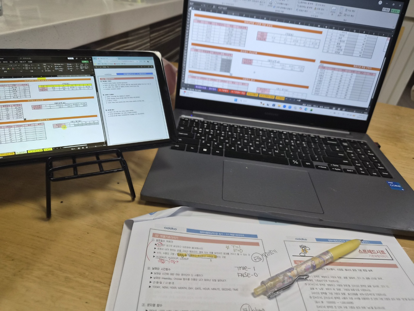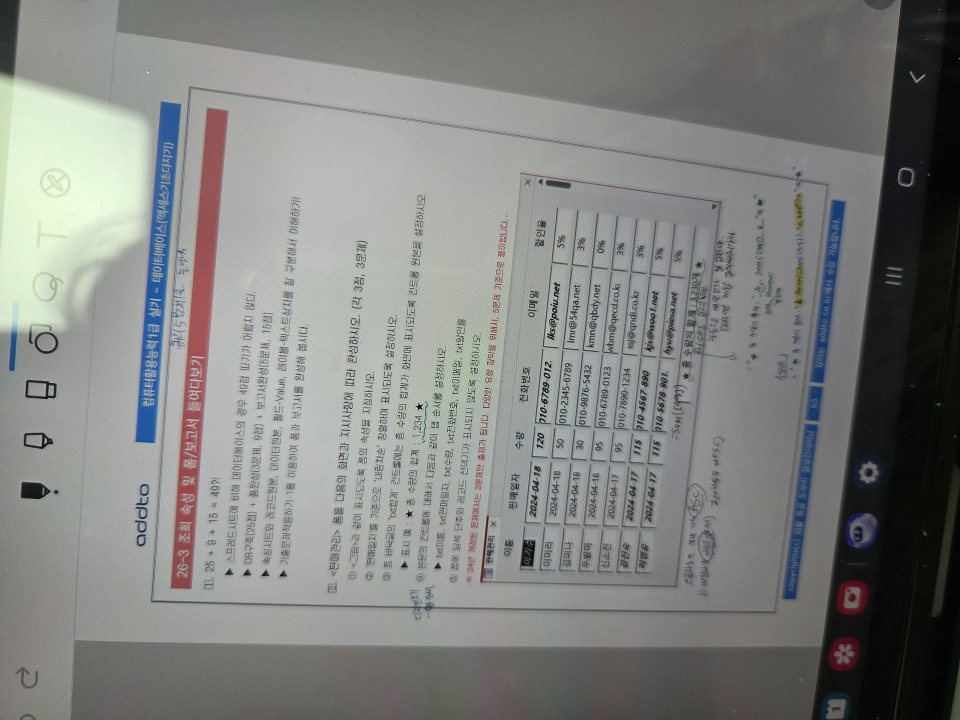 특히 액세스는 처음 들어서 처음에 따라가기 너무 힘든 거에요. 그래서 교재를 하나는 필기 있는 버전, 하나는 필기 없는 버전으로 해서 처음에 할 때는 필기 마구마구해서 밖에서도 쉽게 볼 수 있게 메모를 했구요. 하나는 필기 없는 버전으로 해서 실전처럼 연습할 때 패드 세로로 세운 후에 시험장처럼 연습했습니다!
