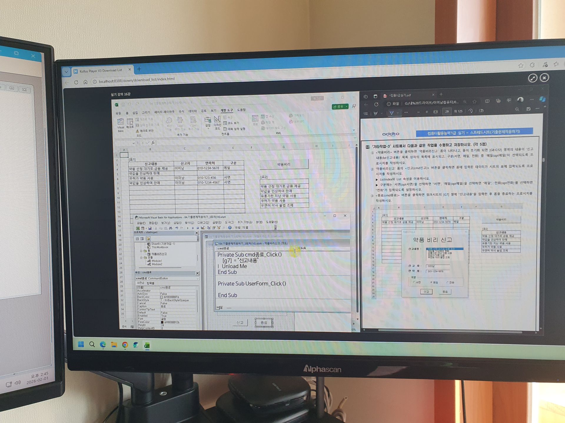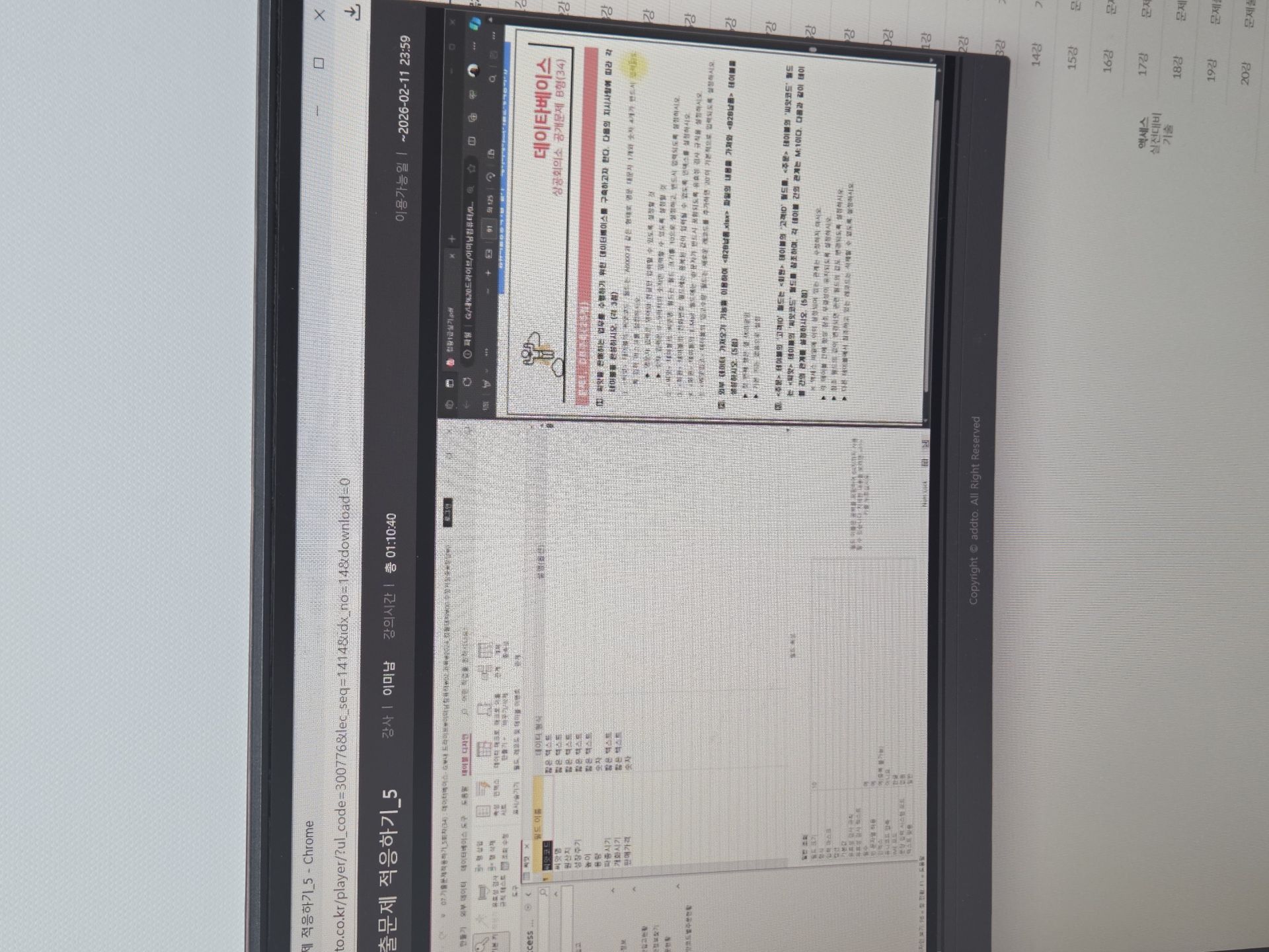 저는 필기 부분과 실기 부분을 종류대로 프린트 하고 탭으론 인강을 듣고 컴퓨터로 따라하면서 수업을 들었는데요,