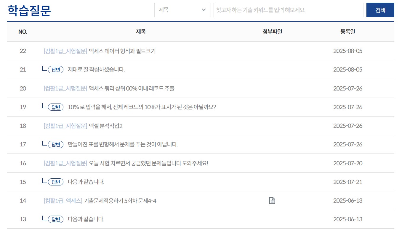 kaka**** / 2025-12-09 ① 제목: 컴퓨터활용능력 실기시험 7번만에 합격후기 ㆍ저는 나이가 50이 넘은 공무원입니다. 평생학습교육관과 유투브 채널을 통해 2급을 1번에 통과했고 엑셀을 통해 스프레드시트의 매력에 빠졌습니다. 그리해서 1급도 쉽게 접근하였습니다. 그래서 유부브 무료 강좌를 통해 공부를 했는데 필기부터 난관에 봉착했습니다. 그래도 열심히 한끝에 필기는 어찌어찌 합격했지요. ㆍ문제는 실기가 문제였습니다. 혼자 공부하며 3회차까지 시험을 보는데 공부하며 접했던 문제는 거의 나오지 않고 너무 어려워서 AI에게 가장 최신기출을 많이 다루는 인강을 추천해 달라고 했습니다. 을 추천해 주었고 100%환급반이 있다는 것을 알고 신청하여 공부를 하였습니다. ㆍ에서 기초는 2주 정도 공부한 후 심화부스트 문제를 위주로 3번정도 반복하여 풀었습니다. 심화문제가 도움이 많이 되었던것 같습니다. 그러나 그것만으로는 합격하는데 부족한 부분들이 많이 있더라구요. 실기시험을 보면서 처음 접하는 문제들이 많이 보입니다. ㆍ모르는 것과 시험장에서 못푼 문제 등은 이미남 선생님께 질의하면 바로바로 피드백을 주셔서 너무 좋았습니다. 그리고 최신 기출문제는 반드시 꼭 풀어보고 실제시험에 임하는 것을 추천합니다. 최신기출에서 동일한 패턴의 문제들도 상당수 있더라구요. ㆍ시험에 처음 접하는 문제는 고급 필터, 조건부 서식인데 뭔지 모르지만 점수가 잘 안나오는 부분입니다. 꼬아서 문제를 출제하는 경향이라 실제시험 불합격했을때 이부분에서 점수를 많이 못땄던것 같아요. ㆍ실기시험에서 가장 점수가 안나오는 부분은 함수라 생각합니다. 함수는 진짜로 생각을 많이 해야하는 것도 중요하지만 문제를 판독하는 능력이 선행되어야 한다고 생각합니다. 엑세스도 프로시져나 쿼리도 문제판독이 빨리빨리 안되는 것같아요. 문제를 많이 접해보고 뭘 물어보는 것인지 판독하는 능력을 키우는 것을 선행하면 좋을 것 같습니다. ㆍ7번 시험을 보면서 가장 성적이 않나왔던 부분은 피벗테이블입니다. 피벗테이블에서 행추가, 상위값구하기, 그룹만들기 등 기본적인 것들을 몰랐었는데 그러한 것들이 나오는 추세입니다. 피벗테이블은 세부적인 메뉴까지 모두 알고가셔야 합니다. 강의에서 조금씩 다루는데 강조하지 않는 부분들이라 집중해야 합니다. ㆍ차트도 막대그래프보다는 원형, 방사형 등이 나오는 추세인데 많이 다루지 않아 봐서 당황스럽더라구요. 꼭 익히고 시험에 임하면 좋을 것 같아요. ㆍ프로시져는 일단 간단한 1번과 3번을 먼저 풀고 시간이 있을 때 3번을 푸는 것을 추천합니다. ㆍ는 문제를 많이 풀수록 쉬워지고 시간도 한 10분이상 남게 되더라구요. 문제를 많이 접하고 풀어보는 걸 추천합니다.