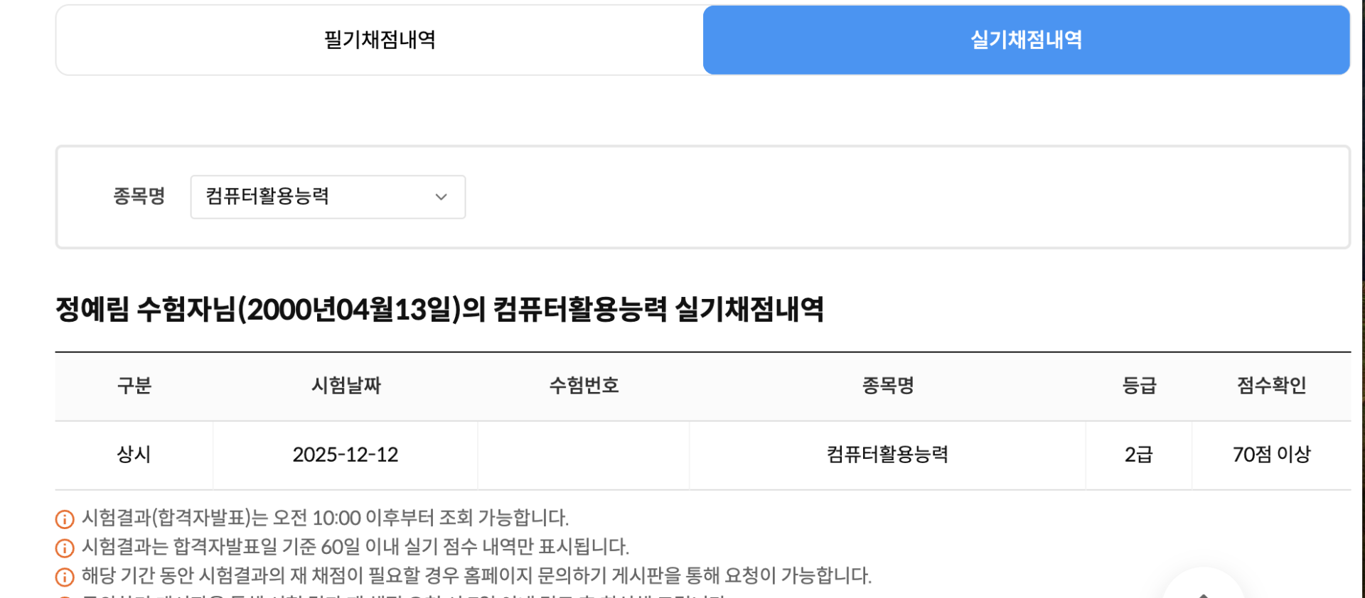 저는 컴퓨터활용능력 2급에 응시하였고, 필기와 실기 모두 1회 응시로 합격하였으며 전체 준비 기간은 약 3주 정도였습니다.